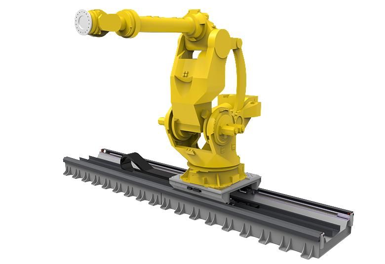 The new robot 7th-axis consists of a or a set of high-strength structural welding sections, after two times stress relieving and the fine finishing of the foundation bed through the precise CNC gantry milling machine and then combine with the hardening and grinding helical gears and racks, finally through the tight fitting of the servo motor and APEX gear box makes the conveying of the robot more precise、steady、smooth and speedy.
